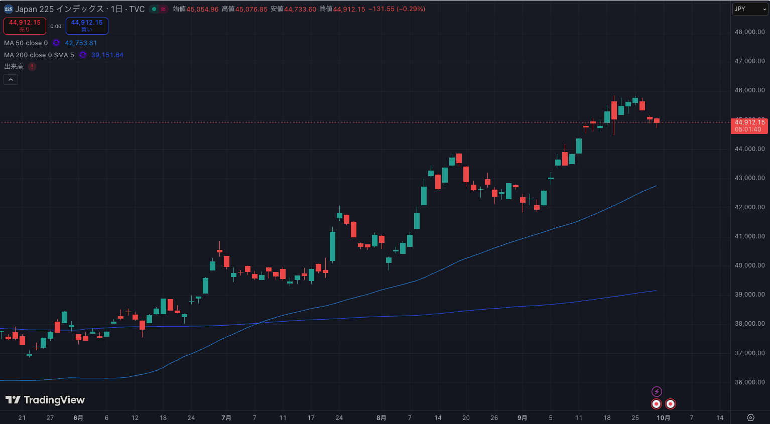 日経平均は強い上昇トレンドで史上最高値更新して一時45000円台に乗せました。