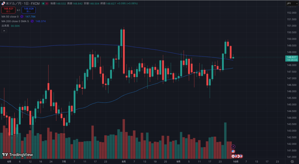 ドル円は150円届かないあたりでヨコヨコです。