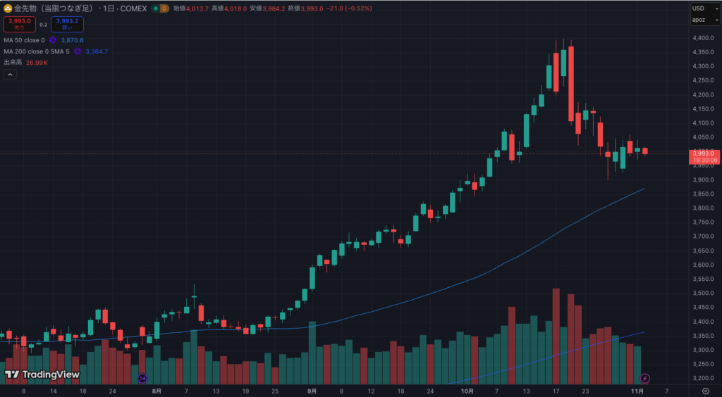 金先物価格は直近数ヶ月は上げ続けていたものの大幅な下落となっています。