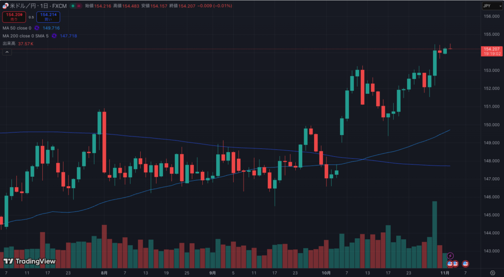 為替のドル円は高市氏が総理に任命されてから窓を開けて円安方向へ向かいました。