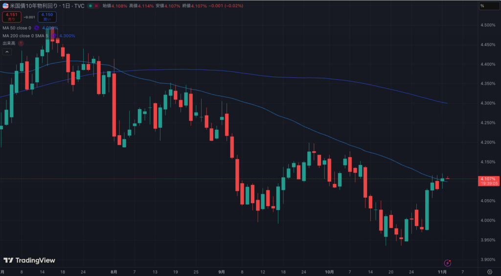 米10年債利回りは下落トレンドの中で反発しているところです。