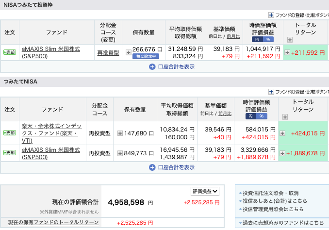 投資元本は2,433,313円で含み益が+2,525,285円となっています。