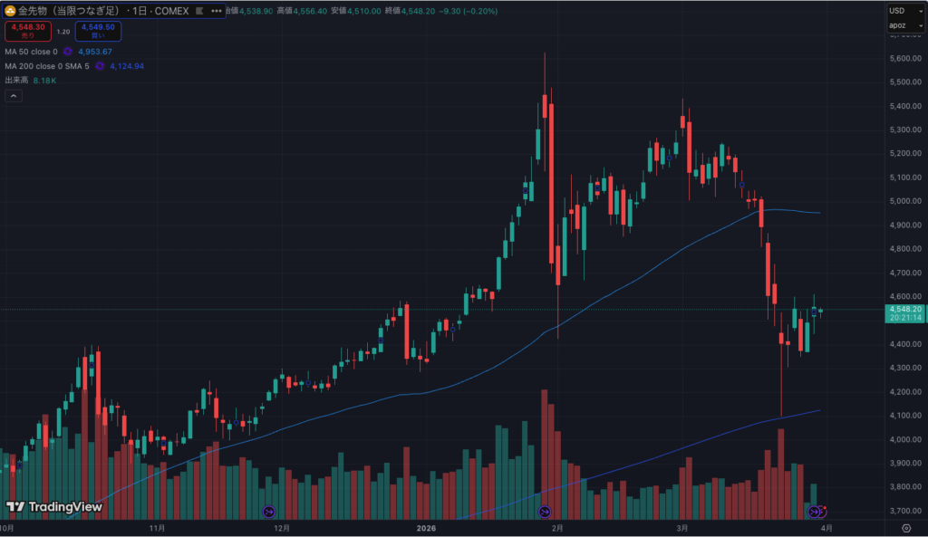 金先物価格は一月末の暴落から一度値を戻しましたが、再度急落しています。