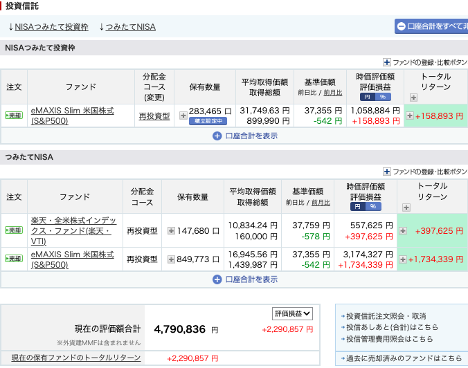 投資元本は2,499,979円で含み益が+2,290,857円となっています。